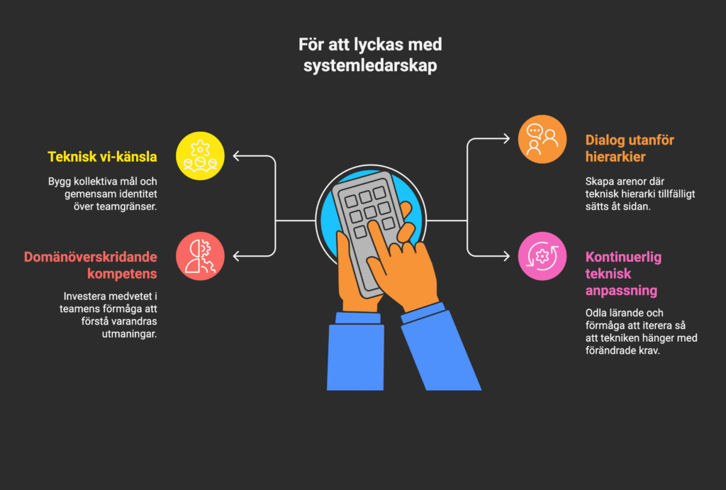 Rapporten identifierar fyra kritiska byggstenar för att lyckas med systemledarskap i IT (nedan anpassade till sammanhanget):
